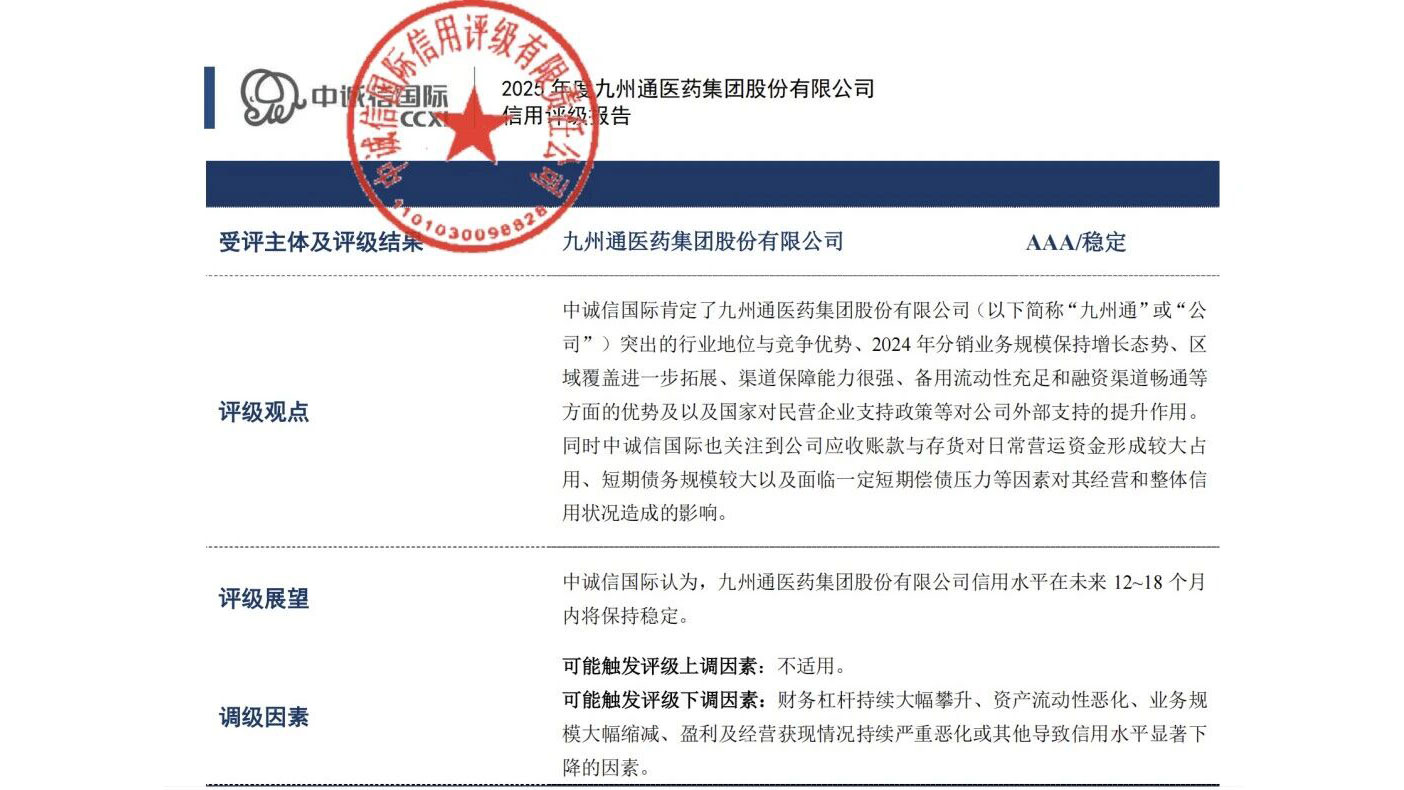 2025年 8月25日,公司主体信用等级晋升为“AAA”,评级展望为“稳定”,成为医药流通行业唯一获得AAA信用等级的民营企业。